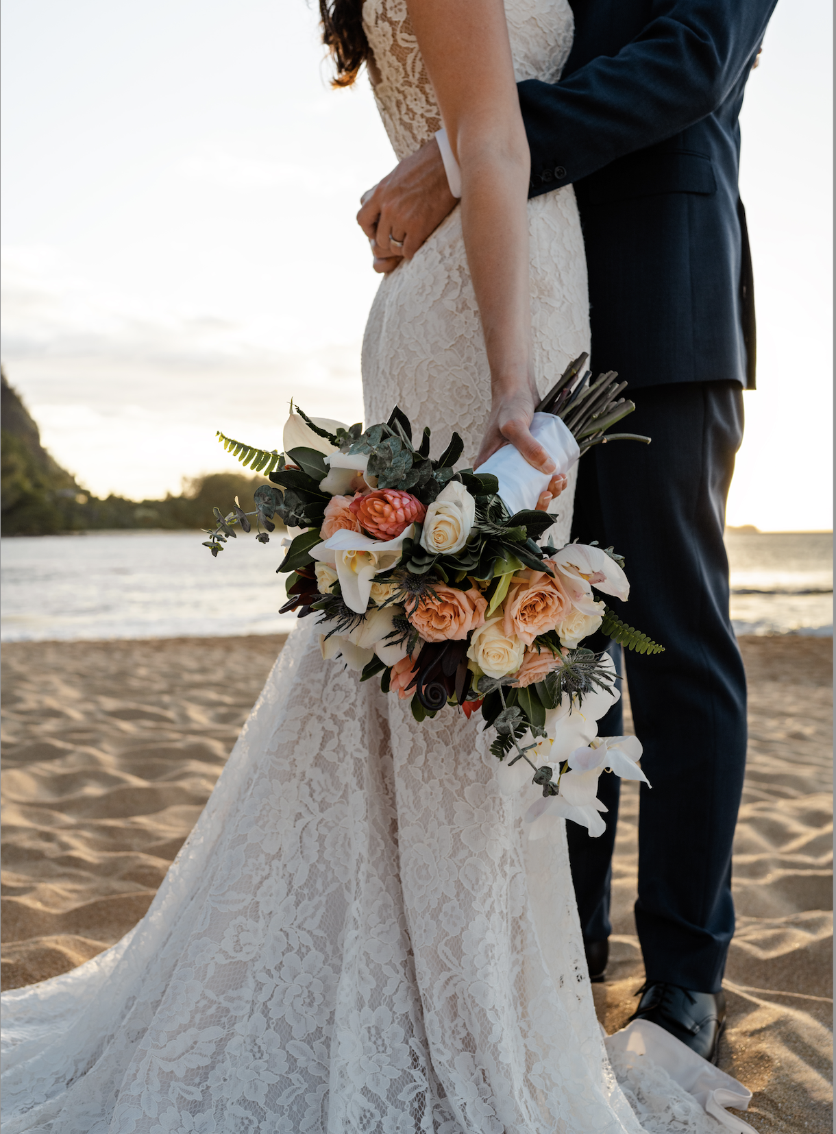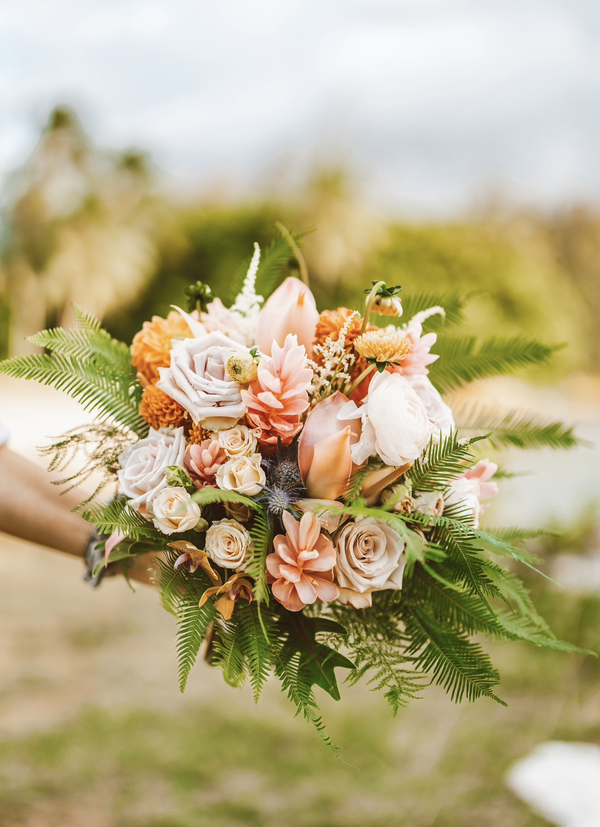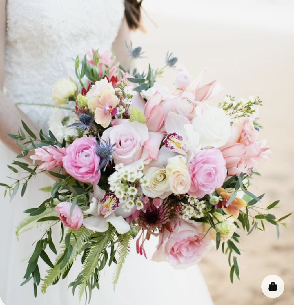 A rustic, textured and less structured style of bouquet. Can include eucalyptus and a combination of flowers that fit the season. There's a loose, organic feeling, usually incorporating wildflowers and traditional blooms such as spray roses and scabiosa pods blend together. You can choose a color palette.